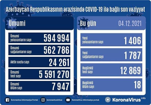 Azərbaycan Respublikasında koronavirus (COVID-19) infeksiyasına 1 406 yeni yoluxma faktı qeydə alınıb, 1 787 nəfər müalicə olunaraq sağalıb.