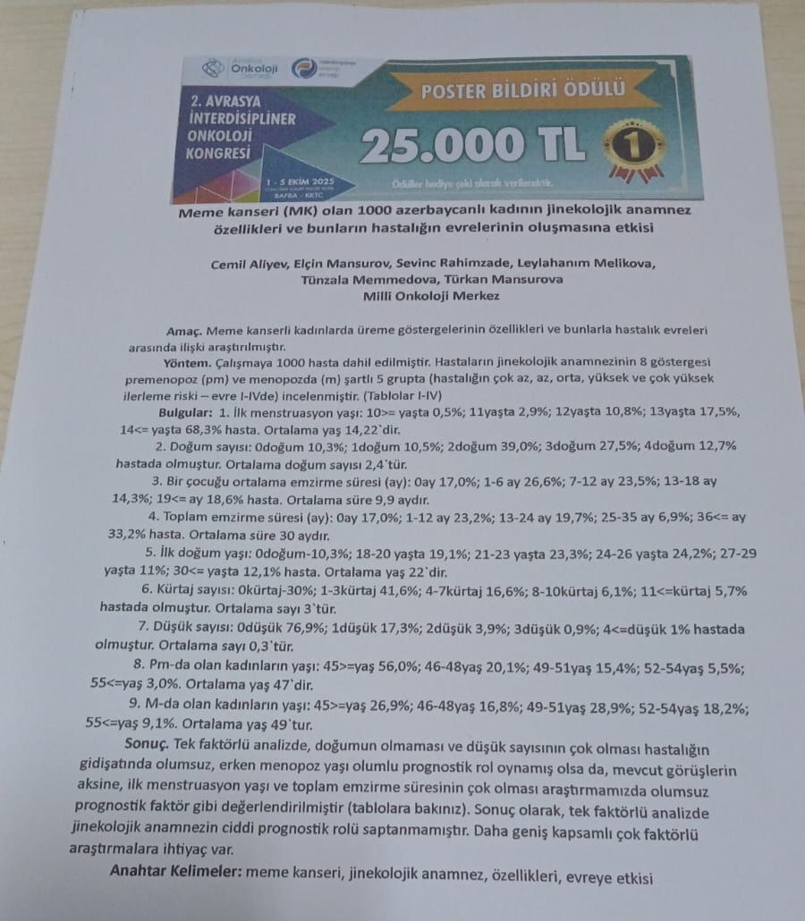 Azərbaycanlı həkimlər, Milli Onkologiya Mərkəzinin əməkdaşları Şimali Kiprdə keçirilən II Avrasiya İnterdisipliner Onkologiya Konqresində ölkəmizi təmsil ediblər. Konqresdə Orta Asiya ölkələrindən, Türkiyədən çox sayda alim və həkim iştirak edirdi. Azərbaycandan isə 19 həkim qatılmışdı və 12 elmi məqalə təqdim edilmişdi.