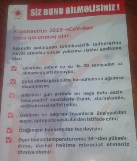 Məlumat lövhəsində qeyd edilib ki, sabunla 20 saniyədən az olmamaq şərtilə əlləri yumaq lazımdır. Çirkli əllərlə gözə, buruna, ağıza toxunmaq olmaz. Əlləri gün ərzində dezinfeksiya edici vasitələrlə (spirt, xlorheqsidin, antibakterial solfet) silmək tövsiyə edilib.