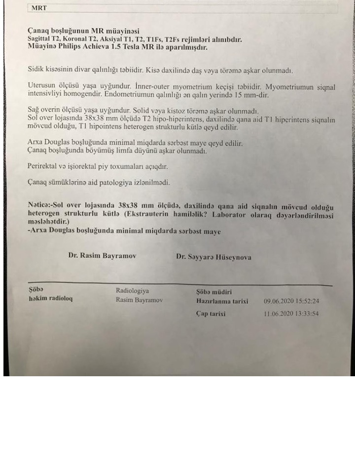MRT müayinəsinin cavabında pasiyentdə sol yumurtalıq lojasında içi qan sızmalı törəmə qeyd olunub və rəydə "ekstrauterin hamiləlik (?) sual işarəsi ilə vurğulanmaqla" diaqnozu qoyulub.