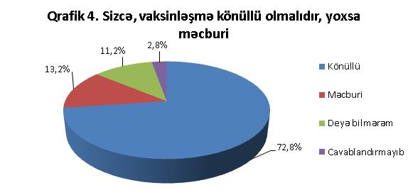 4. Respondentlərin böyük əksəriyyəti (72,8%) vaksinəşmənin könüllü olmasını dəstəkləyib. Cəmisi 13,2%-i məcburi vaksinləşmə tərəfdarı olub.