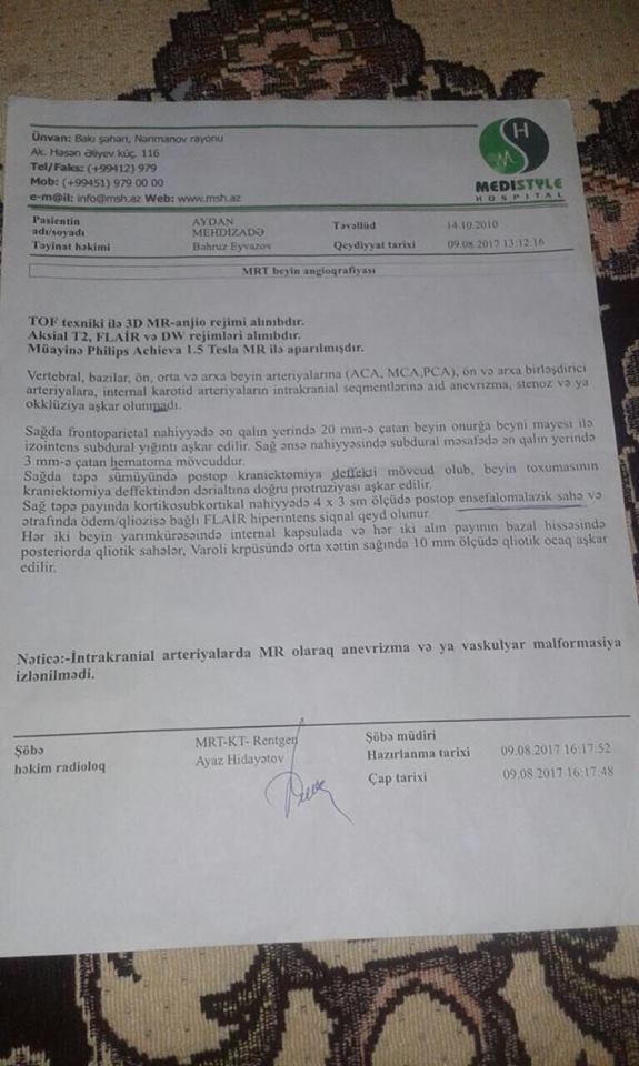 "Üç ay əvvəl uşaqda qəflətən baş ağrısı olub, sudurga keçirib. Birinci dəfə həkimə xəstəxanaya apardıq, ilk müayinə zamanı beyninə qan sızdığı bilinmədi. Amma sonradan məlum oldu ki, uşağın beyninə qan sızıb. Uşağı ölümcül vəziyyətdə Bakıya gətirdik. Neyrocərrahiyyə xəstəxanasına gətirdik. Bir sutka orda qaldı, müayinələr aparıldı, səhəri əməliyyat olundu. Uşaq 55 gün komada qalıb, sonra ayılıb. İki aydan çox neyrocərrahiyyə xəstəxanasında yatandan sonra evə yazdılar. Evə gətirəndən sonra uşağın halı yenidən pisləşdi. Bu səbəbdən də yenidən Bakıya qaytardıq. Müayinələr oldu, yenə də evə yazdılar. Amma baxıram ki, uşaq da heç bir irəliləyiş yoxdur. Uşağı həyat funksiyaları demək olar ki, yoxdur. Xəstəxanada bütün iynə dərmanı özümüz almışıq. Maddi imkanlarımız tamamilə tükənib. Bu üç ay ərzində nəyimiz var idi satmışıq. Bu bir tərəfə, uşaq da günü gündən əriyib gedir”.