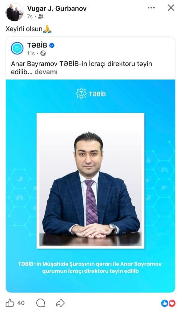 TƏBİB-in sabiq sədri Vüqar Qurbanov yeni icraçı direktor Anar Bayramovu təbrik edib.