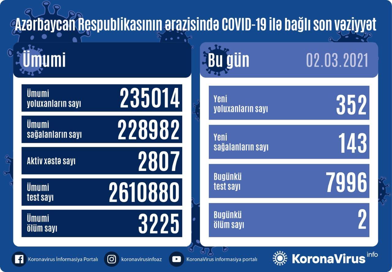Azərbaycanda koronavirus infeksiyasına 352 yeni yoluxma faktı qeydə alınıb, 143 nəfər müalicə olunaraq sağalıb və evə buraxılıb.