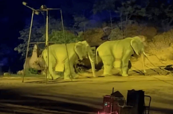 Səhnədə görünən fillərin videosu internetdə yayılıb. Diqqətli tamaşaçılar fillərdən birinin insan topuqlarının çıxdığını görüb.